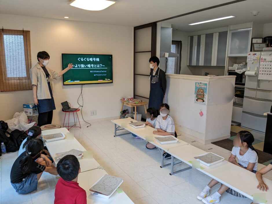 「ぐるぐる暗号機」は自分だけの暗号を作ることができる工作です。最初に、シーザー暗号という昔の暗号の解読に挑戦しました。苦戦するかと思っていたのですが、皆さんスムーズに解読していて驚きました。