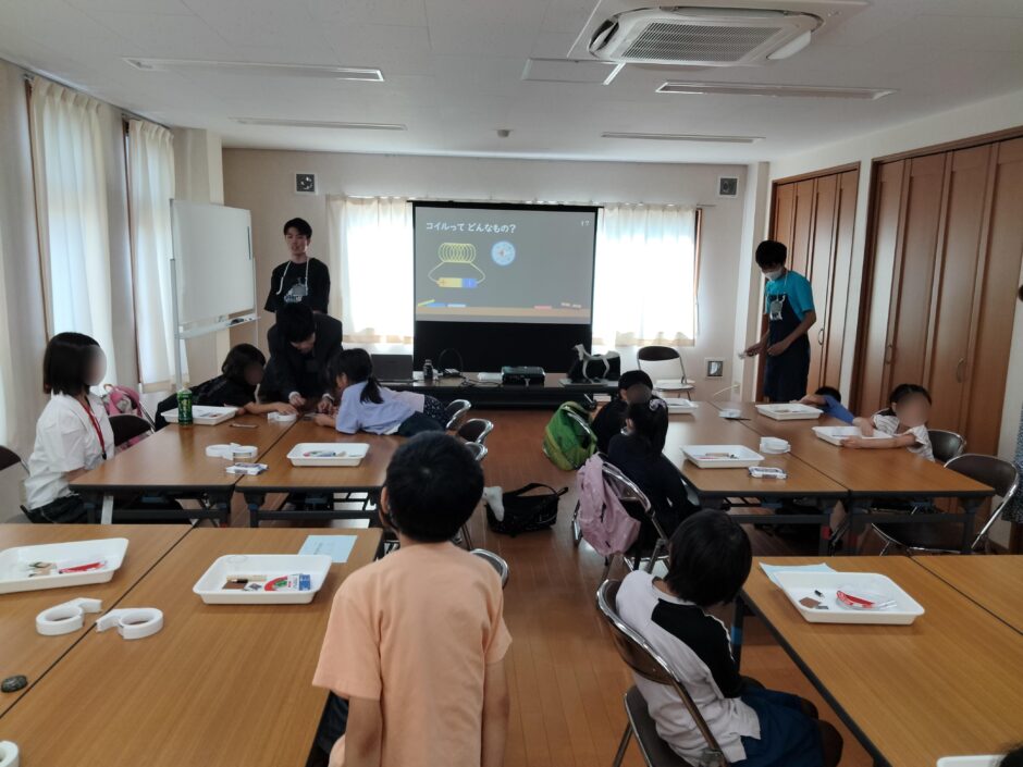 続いて工作の時間です。エナメル線を巻いてコイルを作ったり、プラグにエナメル線の先を巻きつけたりと、細かい作業が多かったのですが、全員無事に完成させることができました。