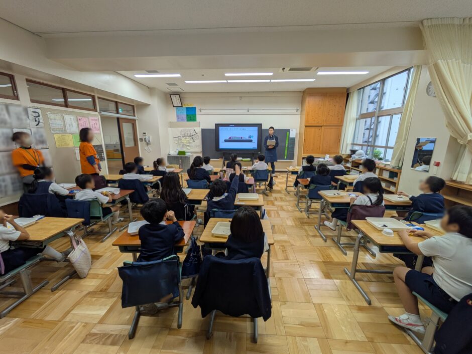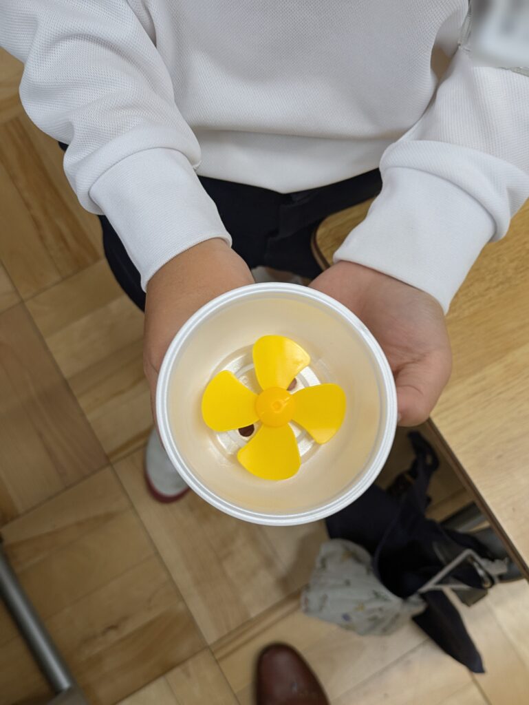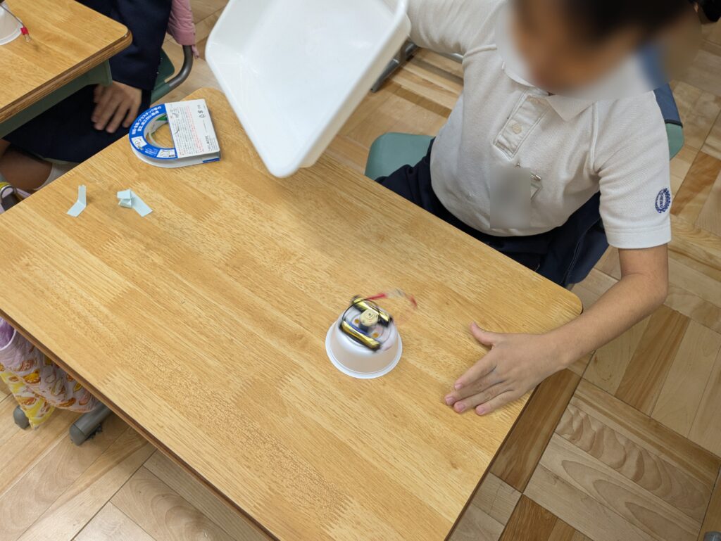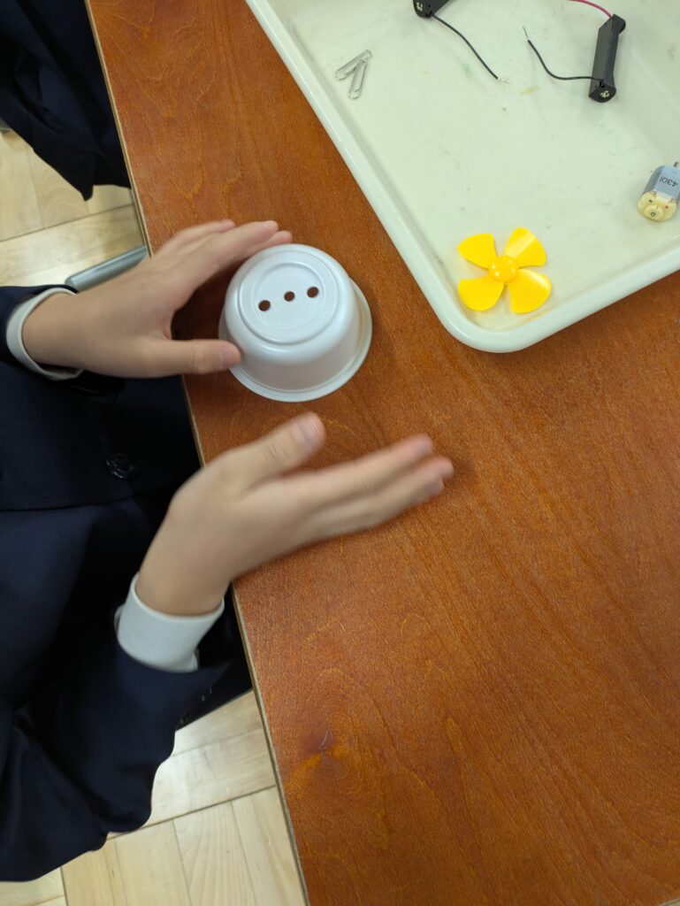 こんにちは!ScienceTechno2年のゆいです。10月22日(水)に、京橋築地小学校の3年生のお楽しみ会として、「ホバークラフト」の工作教室を開催しました。ホバークラフトは、水や地面の上を車輪が無いのにスイスイ進む不思議な乗り物です。この工作教室では、小さなお椀とプロペラを使って、机の上をスイスイ動くおもちゃを作りました。