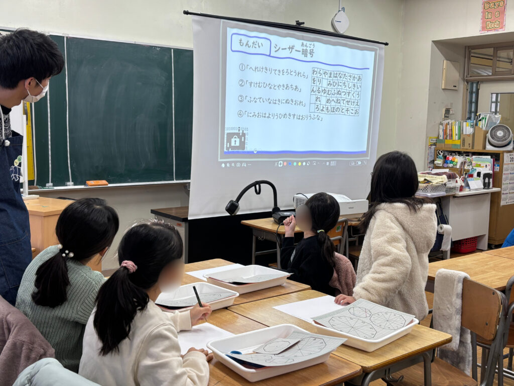初めに、シーザー暗号という、文字を五十音表で決まった数だけ後ろにずらして作る暗号を学びました。その後、子どもたちは暗号の解読に挑戦しましたが、皆さんの解読が非常に早く、スタッフ一同驚かされました。