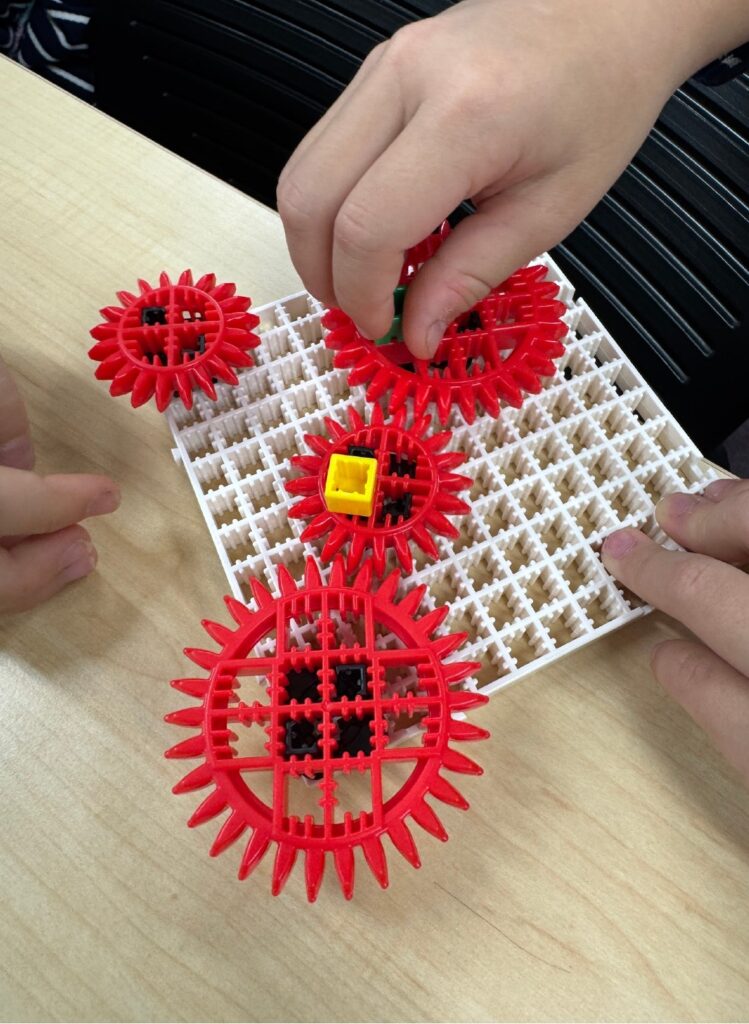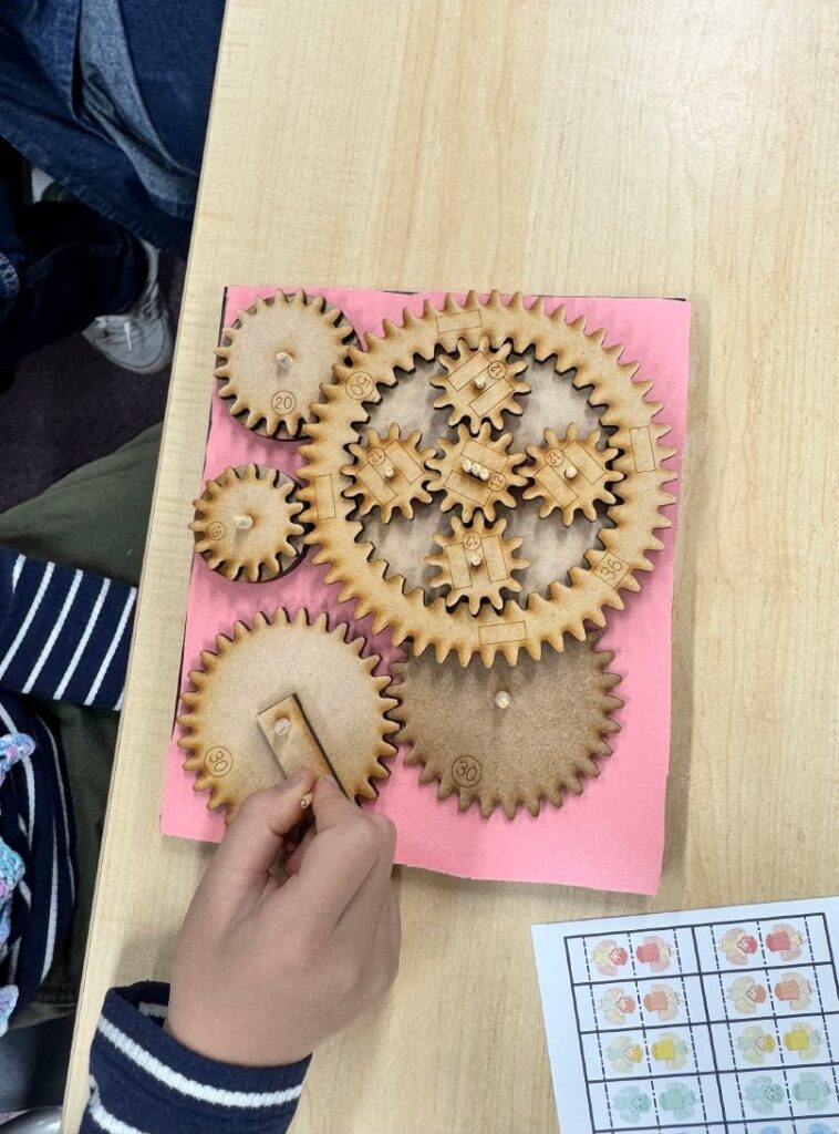 子どもたちは歯車を実際に触って、回転の向きや速さの違いを体験していました。